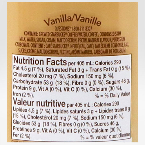BREWED STARBUCKS COFFEE (WATER, COFFEE), CONDENSED SKIM MILK, WATER, SUGAR, CREAM, PECTIN, COCOA, POTASSIUM CARBONATE, ASCORBIC ACID.