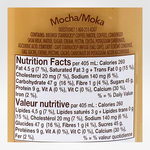 BREWED STARBUCKS COFFEE (WATER, COFFEE), CONDENSED SKIM MILK, WATER, SUGAR, CREAM, MALTODEXTRIN, PECTIN, NATURAL FLAVOUR, POTASSIUM CARBONATE.
